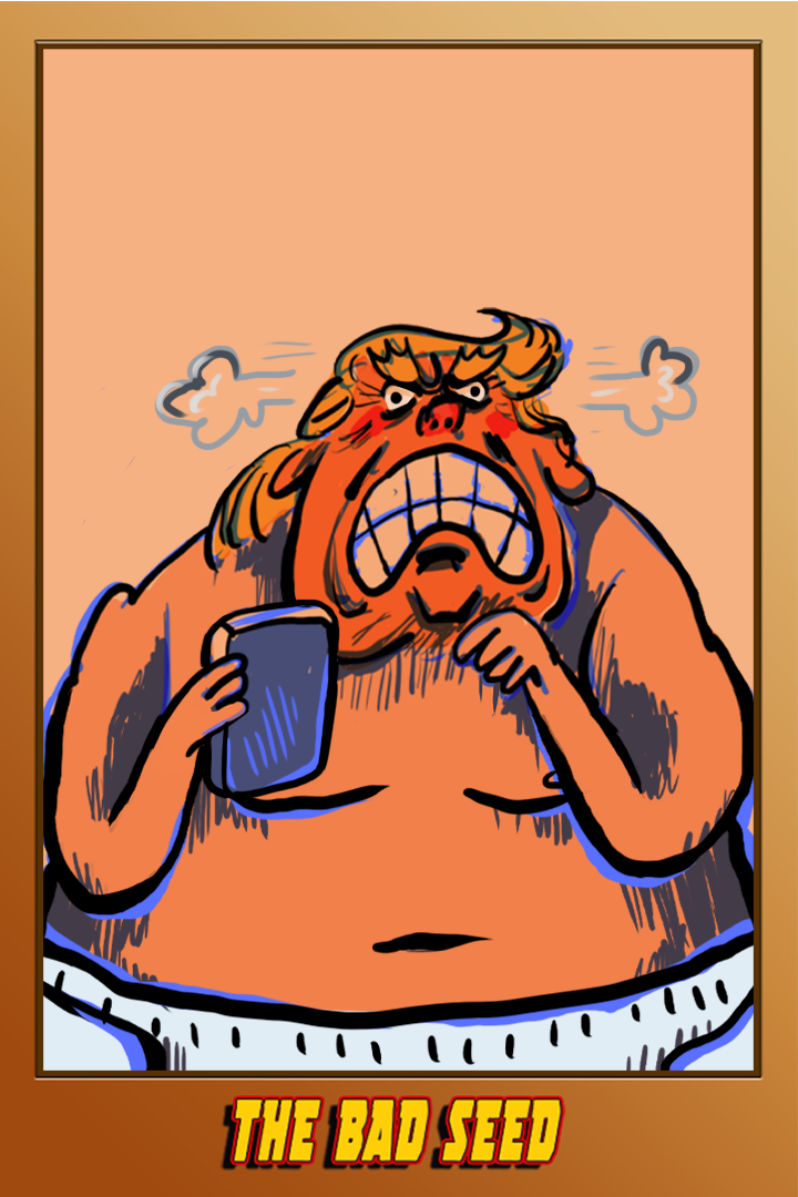 Description: Trump's a bully who intimidates, yells, and cries when he doesn’t get what he wants. The Bad Seeds Book's exclusive art, TRUMPCRYER NFT captures the full range of Trump's bullying expressions - a crying gasp while holding a phone, an angry grit while brandishing a gun, even crying with a burger in hand. The next Presidential election will definitely bring a lot more for him to cry about.