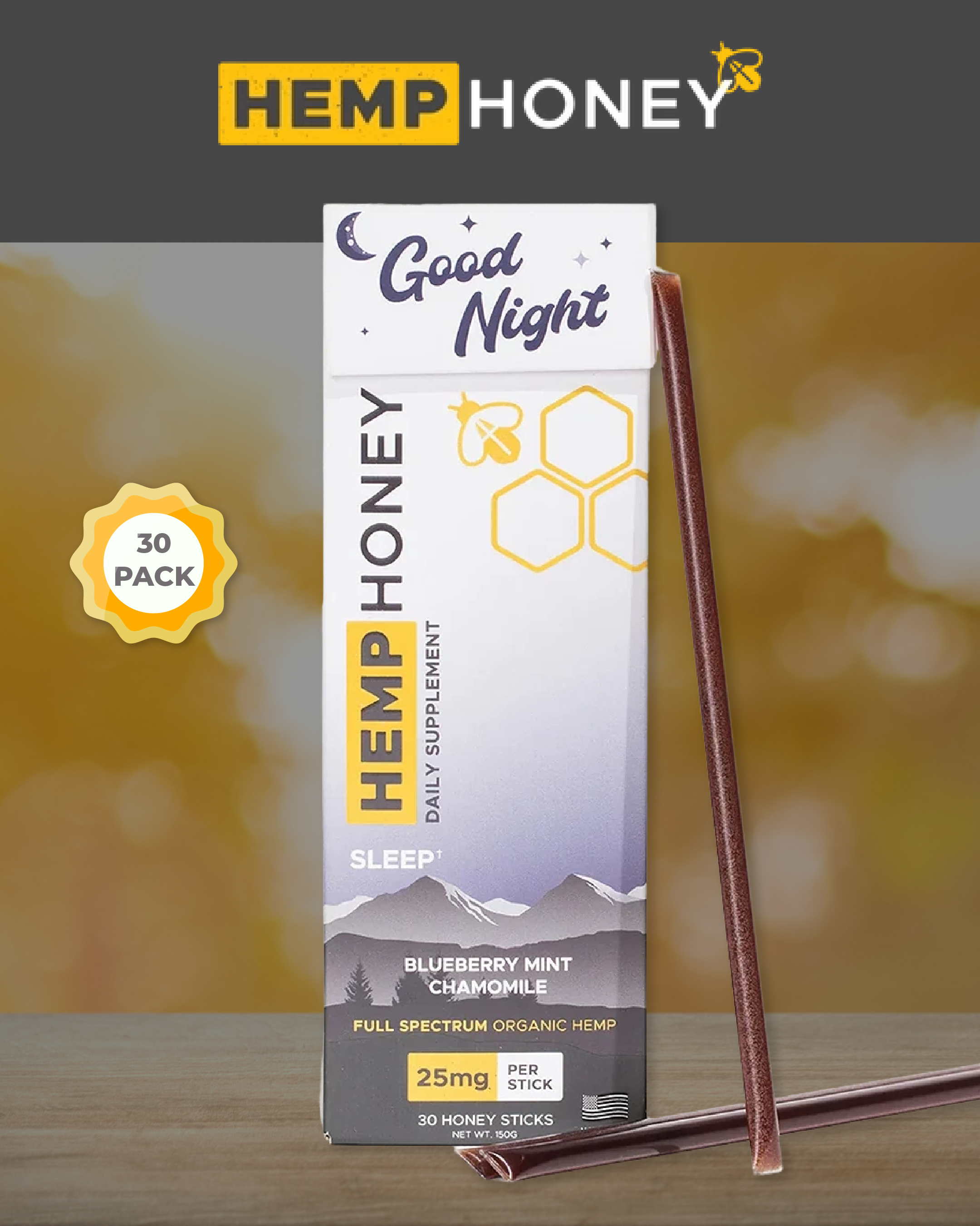 Description: Sleep deeper and wake up more refreshed, naturally, with our Blueberry, Mint, Chamomile flavored Good Night HEMPHONEY sticks. Our USDA Organic Full Spectrum Hemp Extract and Raw Honey from the National Forests of Colorado meet functional and immune boosting antioxidants for a more transformative, restful night. Take it close to bed to help you fall and stay asleep.